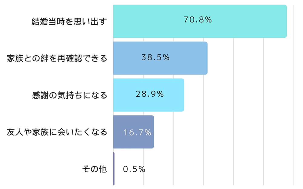 「結婚当時を思い出す」と答えた人が最も多く、70.8%と圧倒的多数を占めました。続いて「家族との絆を再確認できる」38.5%、「感謝の気持ちになる」28.9%が続きます。
