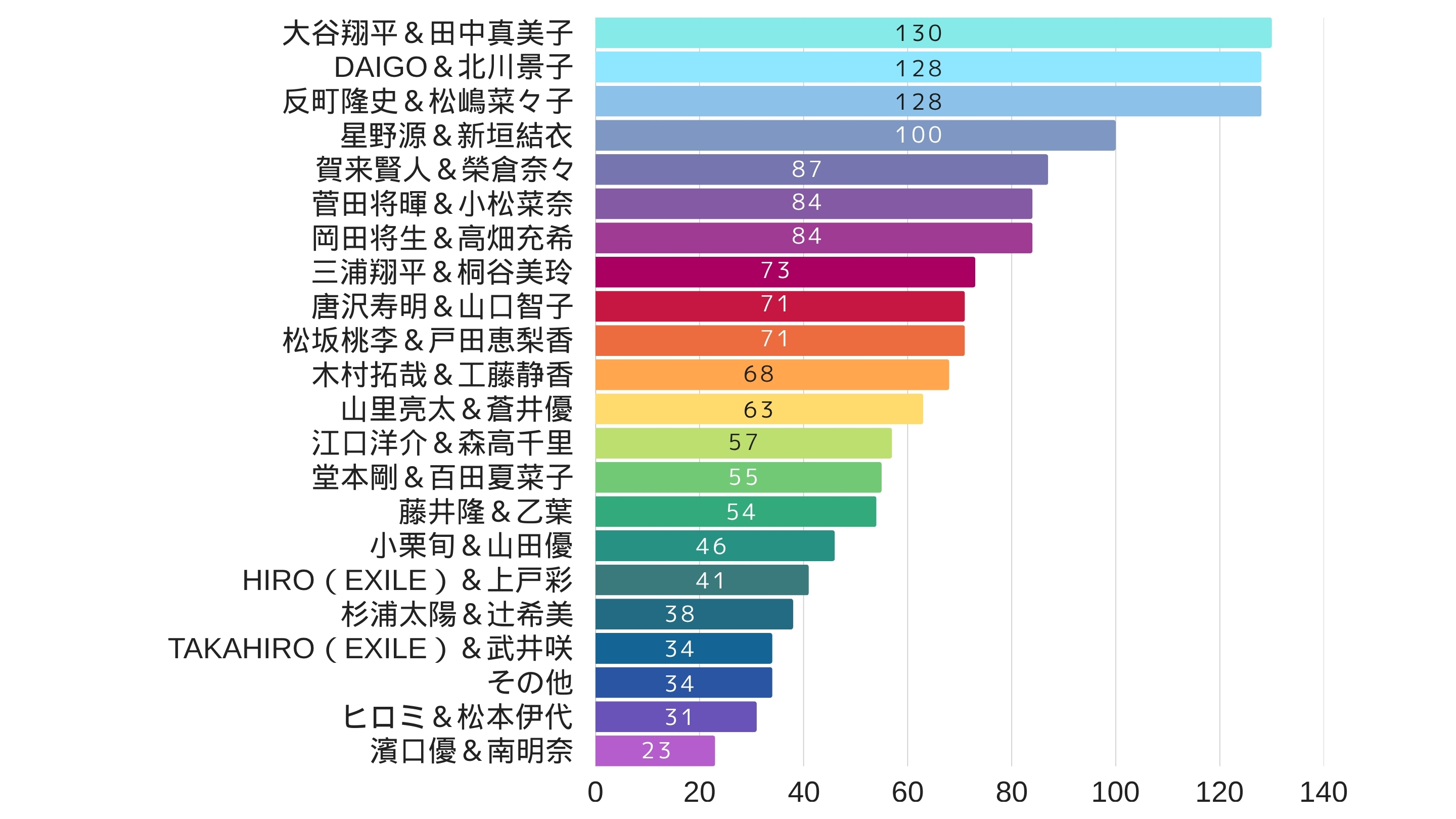 今回ウェディングフォトに関するアンケート調査にお応えいただいた20代から40代までの既婚男女500名に、1人あたり3組の有名人夫婦に投票いただきました。