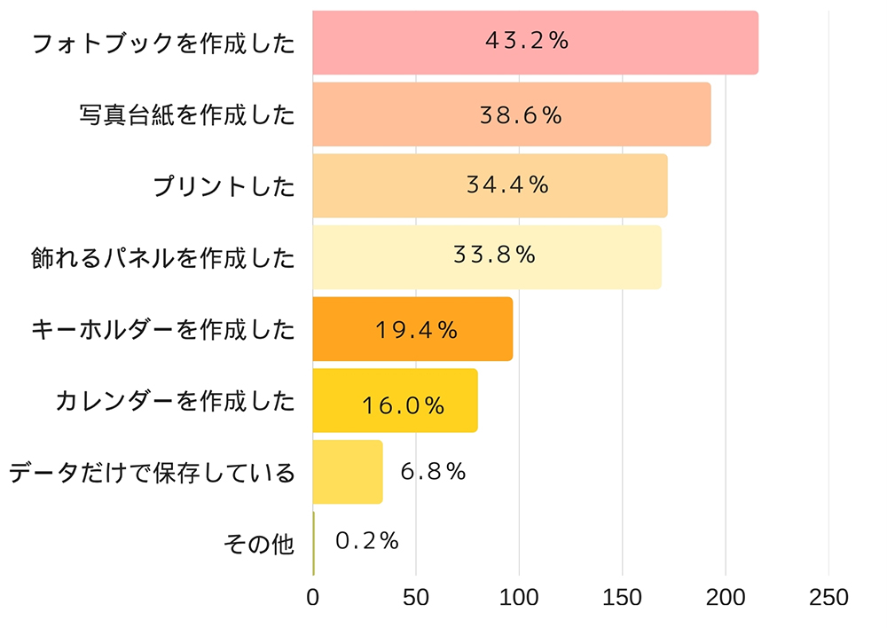 一方で、「フォトブックを作成した」(43.2%)「写真台紙を作成した」(38.6%)「飾れるパネルを作成した」(33.8%)など、手に取れる形で残す人が多数派であることがわかります。