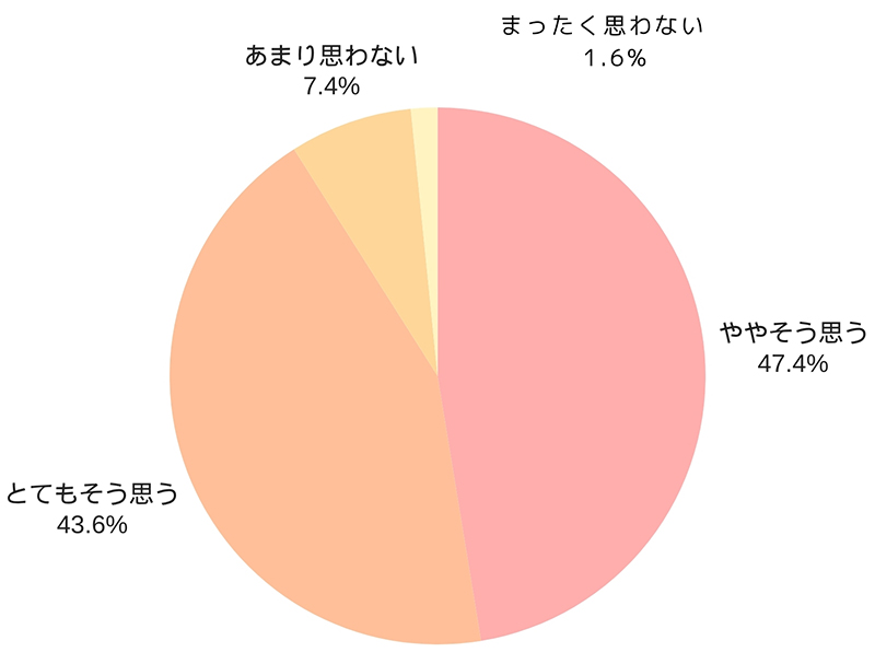 「とてもそう思う」(43.6%)と「ややそう思う」(47.4%)が大半を占め、否定的な回答はわずか9.0%にとどまります。