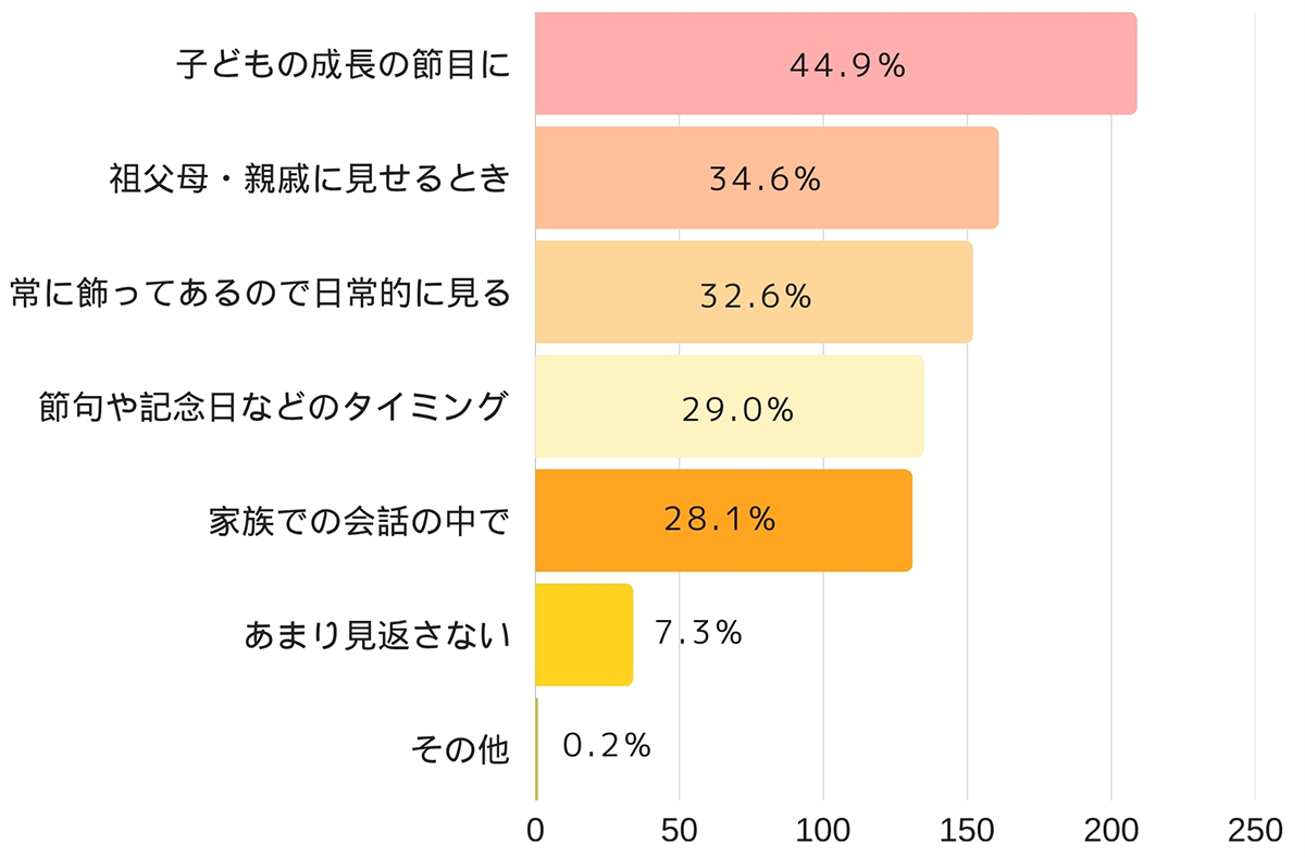 特に「子どもの成長の節目に」(44.9%)、「祖父母・親戚に見せるとき」(34.6%)、「日常的に飾っているため目に入る」(32.6%)といったシーンが多く挙げられています。